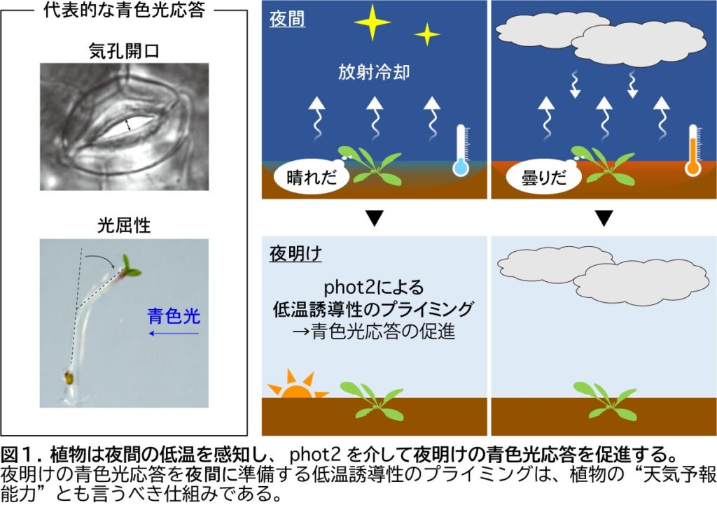 - 本研究では、植物の青色光と温度のセンサタンパク質であるフォトトロピン2(phot2)が夜間の低温を感知することで、夜明けの青色光応答を促進することを明らかにしました。