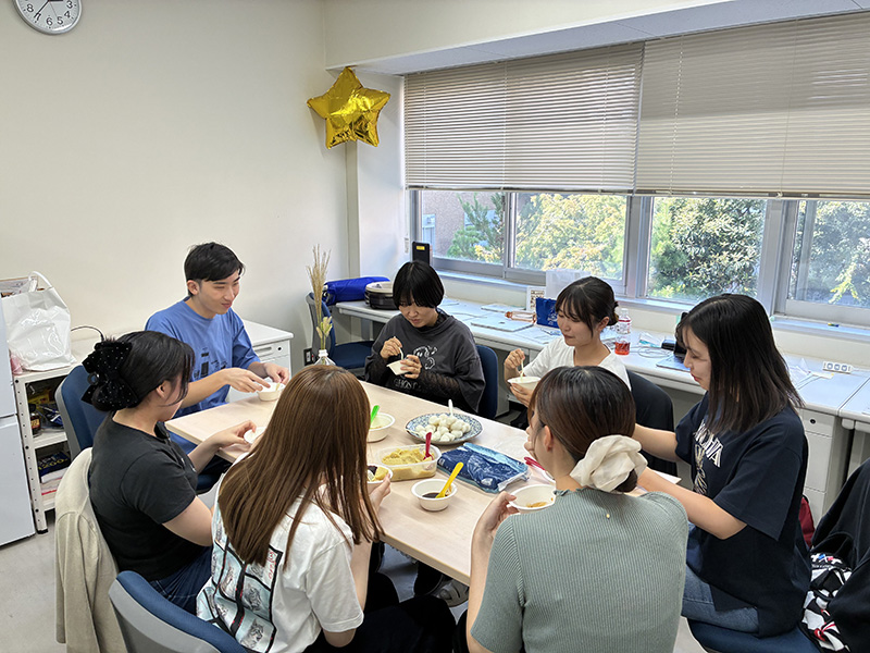 学生部屋が騒がしいので覗いてみたら、学生が団子を手作りして、月見をしていました。後ろの星が月だそうです。