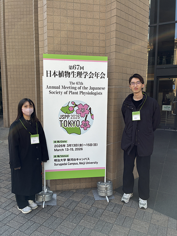 第67回日本植物生理学会 投稿者: nomura | 2026年3月17日 0件のコメント2026年3月13日〜15日に明治大学駿河台キャンパスにて開催された第67回日本植物生理学会に参加しました。研究室からは濱田君と中村さんが参加してポスター発表を行いました。濱田君はこれが最後の学会発表となりました。思い残すことなく次の一歩を力強く踏み出してくれると思います。Bluesky