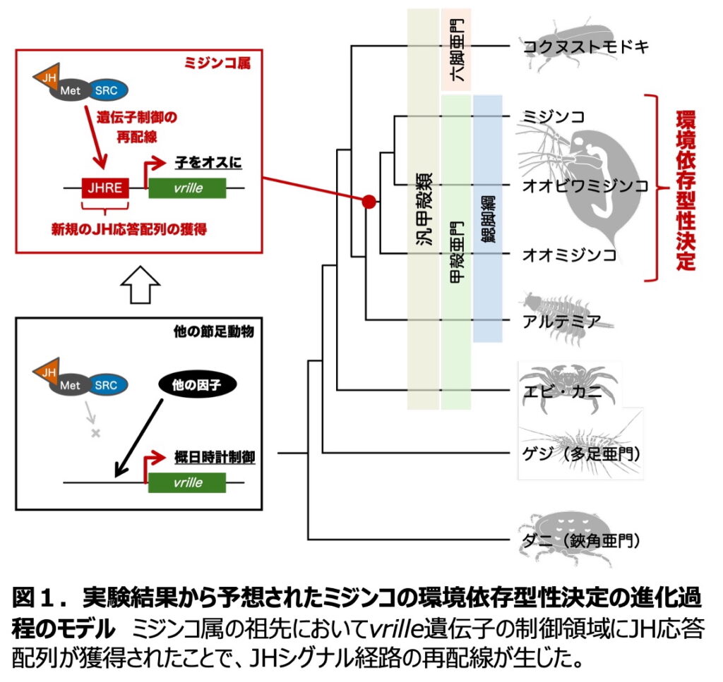 本研究は、幼若ホルモン(JH)という節足動物に広く保存された内分泌因子が、進化の過程で新たなDNA配列(JH応答配列)を獲得することで、既存の遺伝子(概日時計遺伝子 vrille)を環境依存型性決定という新しい生物学的機能へと組み込んだことを、分子レベルで明らかにしました。これは、生物進化において、ホルモンや遺伝子などの生体因子の間の制御関係が繋ぎ変えられる「再配線」の重要性を理解する上で重要な知見です。またJH様物質は殺虫剤の成分としても使用されているため、外部から暴露されたJHがどのようにしてミジンコの性を変化させるかその分子機構の一端を明らかにした本研究は、内分泌かく乱現象の分子基盤理解にも貢献する成果です。