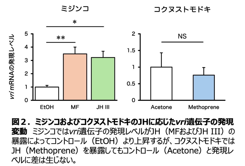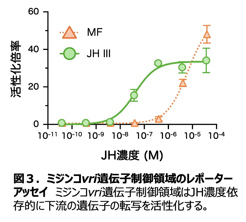 vrillevri)遺伝子が、ミジンコではJH受容体複合体(Met/SRC)により直接転写活性化注2)される「JH標的遺伝子」であることを突き止めました。