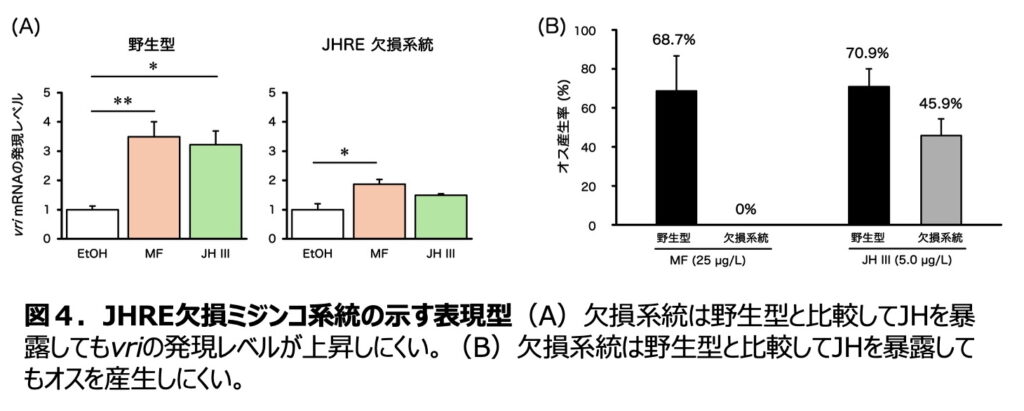・オスを産む際には、母親の幼若ホルモン(JH)注1)シグナルが活性化することが知られていましたが、その下流でどのようにして子の性が変化するか、そのメカニズムは未解明でした。